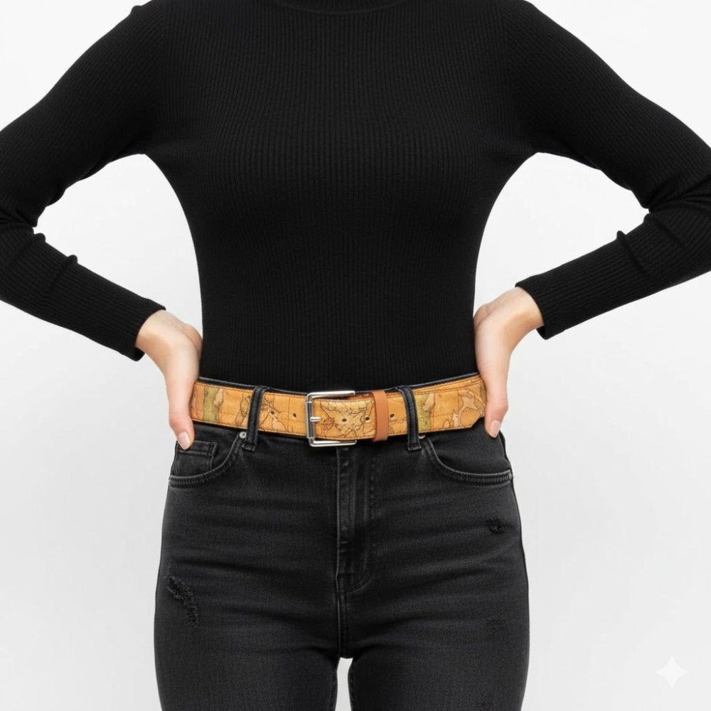 Cintura unisex in tessuto stampato con cartina geografica Geo Classic, con fibbia rettangolare, metalleria con logo 1°Classe e finiture in nickel. Moderna e sportiva, darà un tocco esclusivo agli outfit uomo e donna.
