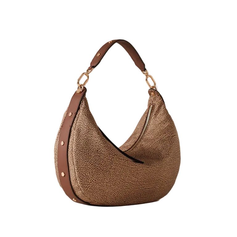 L'iconica silhouette a mezzaluna di Borbonese si veste di un'elegante tonalità Beige/Marrone, offrendo un accessorio che è pura espressione di stile naturale e sofisticato. Questa borsa hobo combina una forma morbida e contemporanea con i dettagli storici del brand, rendendola perfetta per chi cerca una borsa a spalla capiente, leggera e versatile.