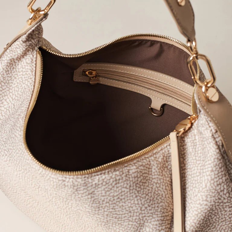 L'iconica silhouette a mezzaluna di Borbonese si veste di un'elegante tonalità Sabbia, offrendo un accessorio che è pura espressione di stile naturale e sofisticato. Questa borsa hobo combina una forma morbida e contemporanea con i dettagli storici del brand, rendendola perfetta per chi cerca una borsa a spalla capiente, leggera e versatile.