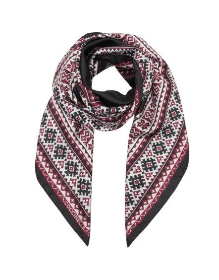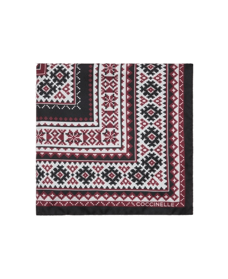 Il foulard Coccinelle Nordic frame s'ispira al tema di collezione ed è rappresentato da un gioco di cornici che viene completato da ulteriori motivi come fiocchi di neve e decorazioni sami