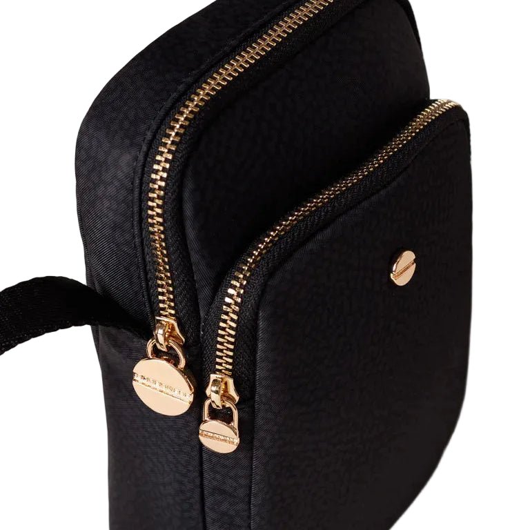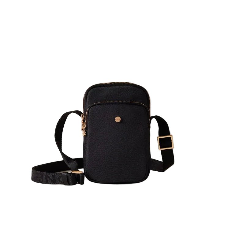 - Tracolla: Cinghia in nastro logato, regolabile e staccabile, per indossarla a spalla, a tracolla o come una pochette.