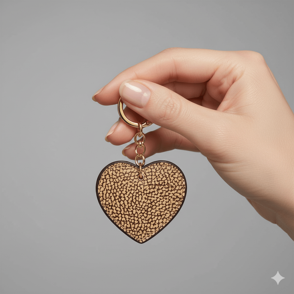 Portachiavi con ciondolo di pelle stampata OP a forma di un romantico cuore. Può essere utilizzato come charm per impreziosire la tua borsa preferita. Galvanica in oro chiaro.