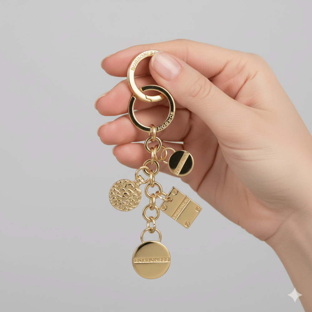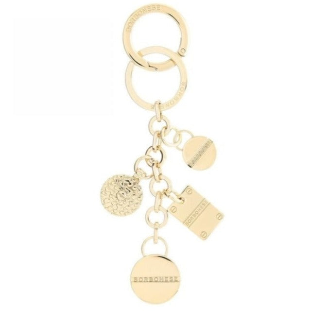 Portachiavi di metallo con charms che riproducono le targhette logate e decorate con il motivo OP. Può essere utilizzato come decorazione per impreziosire la tua borsa preferita. Galvanica in oro chiaro.