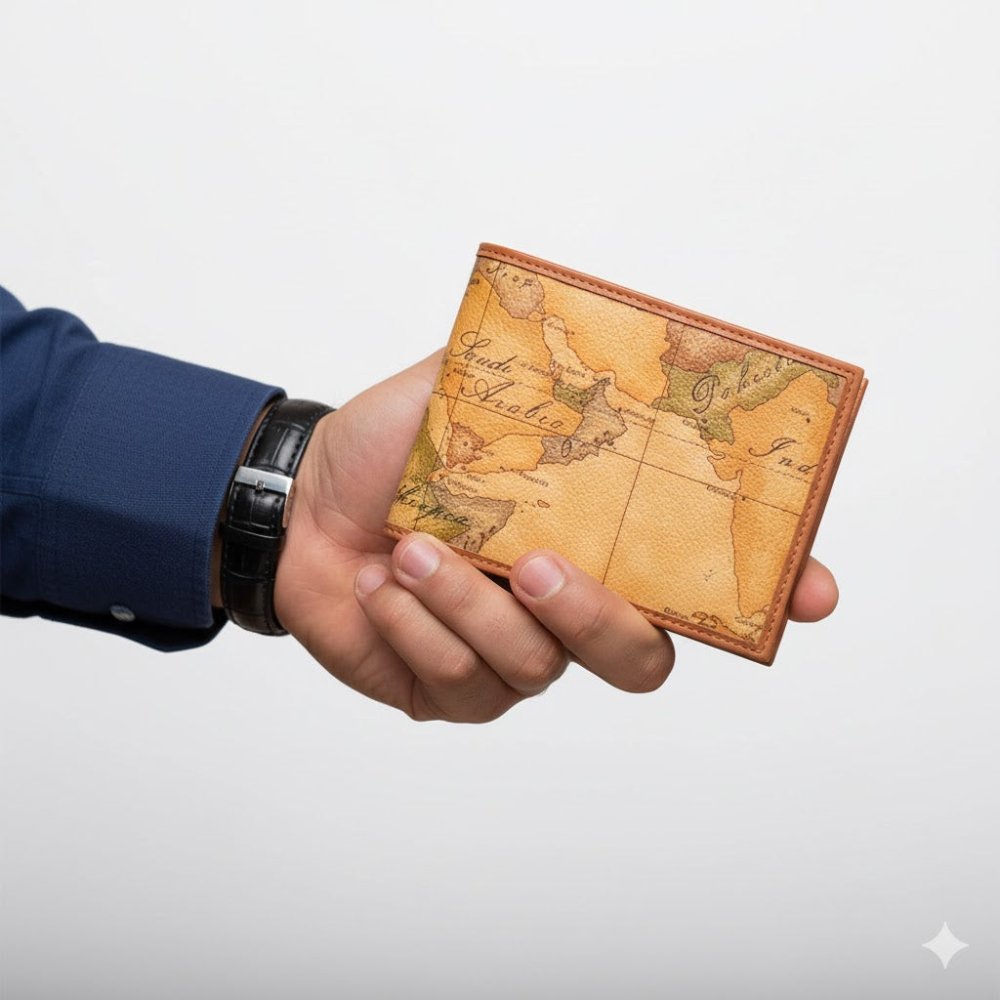 Portafogli uomo in tessuto stampato con cartina geografica Geo Classic, con scomparti per banconote, carte di credito e ricevute, tasca interna portamonete. Pratico e capiente nonostante la forma compatta, con il logo 1AClasse impresso a caldo per un tocco esclusivo.