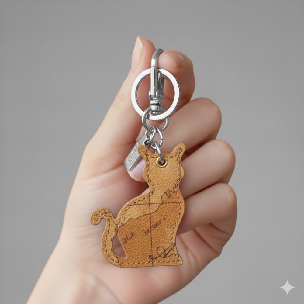 Portachiavi a forma di Gatto in tessuto stampato con cartina geografica Geo Classic con dettagli in pelle liscia di bovino color cuoio, metalleria in oro chiaro con logo 1AClasse, dicitura Made in Italy impressa a caldo sul retro. Utilizzalo anche anche come charm per impreziosire le borse di collezione.