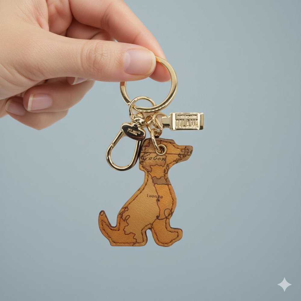 Portachiavi a forma di Cane in tessuto stampato con cartina geografica Geo Classic con dettagli in pelle liscia di bovino color cuoio, metalleria in oro chiaro con logo 1AClasse, dicitura Made in Italy impressa a caldo sul retro. Utilizzalo anche anche come charm per impreziosire le borse di collezione.