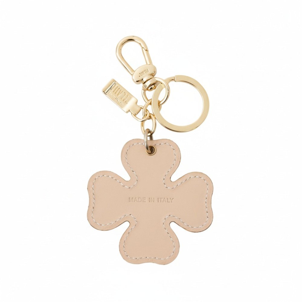 Un raffinato portachiavi a forma di quadrifoglio, che unisce l'iconico tessuto Geo White alla delicatezza della pelle Nude. Un piccolo amuleto di stile e fortuna, perfetto per ogni occasione o come dono speciale.
