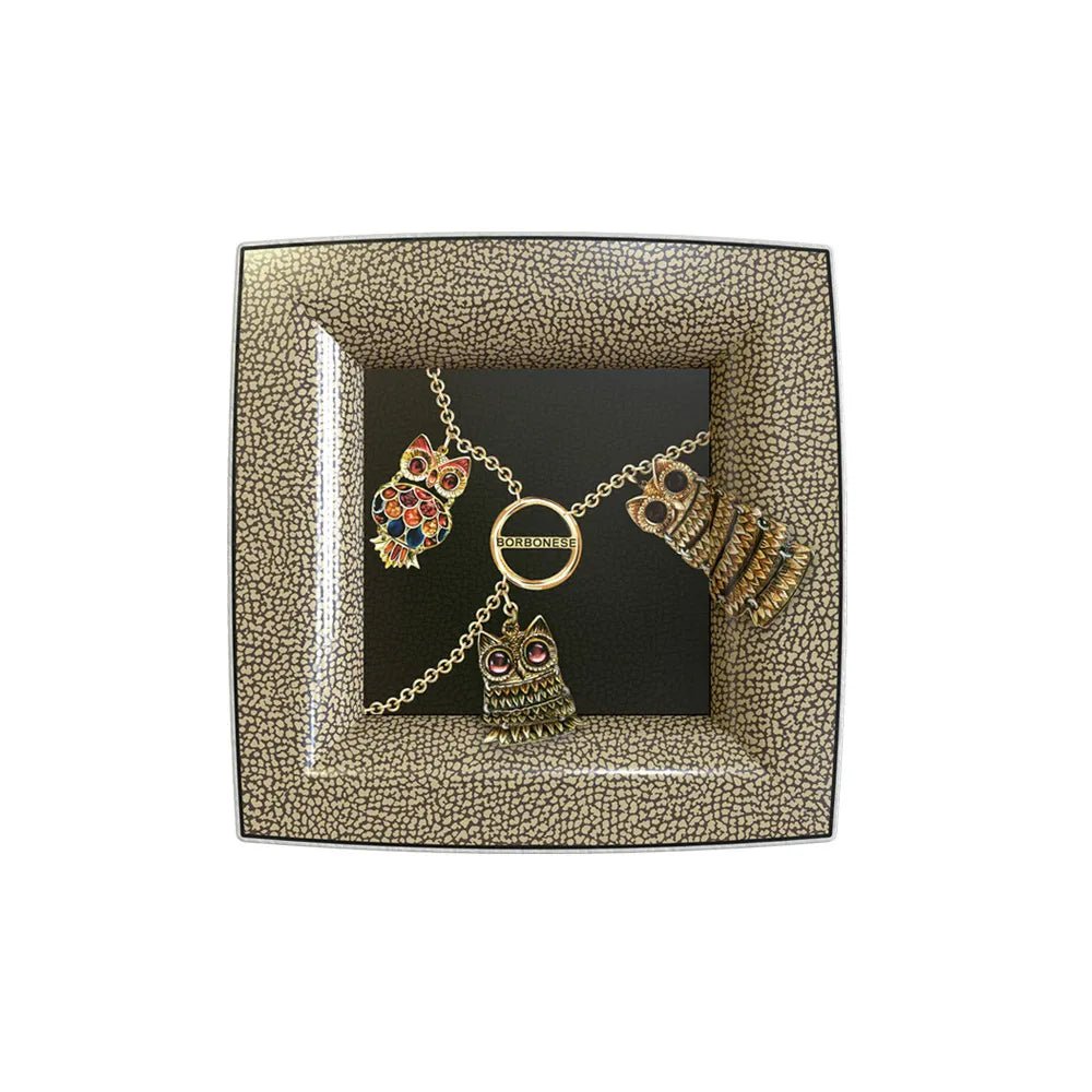 Svuota tasche in porcellana decorata con serigrafia applicata a mano e logo Borbonese. Il design è personalizzato dall’iconica texture “OP” Occhio di Pernice. Confezionato in scatola. Vesti di eleganza la tua casa, con l’esperienza di Tessitura Randi e il design iconico Borbonese.