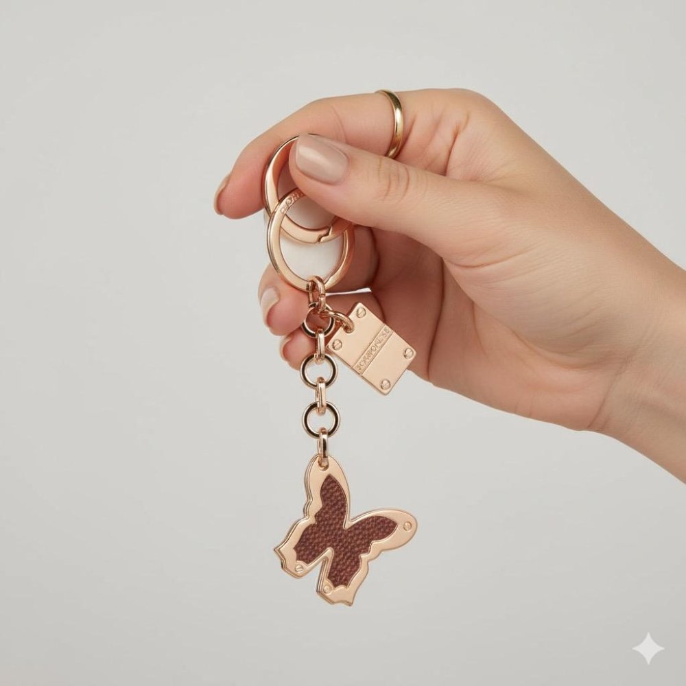 Portachiavi di metallo con l'iconica placchetta logata e una farfalla decorata con motivo OP smaltato. Può essere utilizzato come charm per impreziosire la tua borsa preferita. Galvanica in oro chiaro