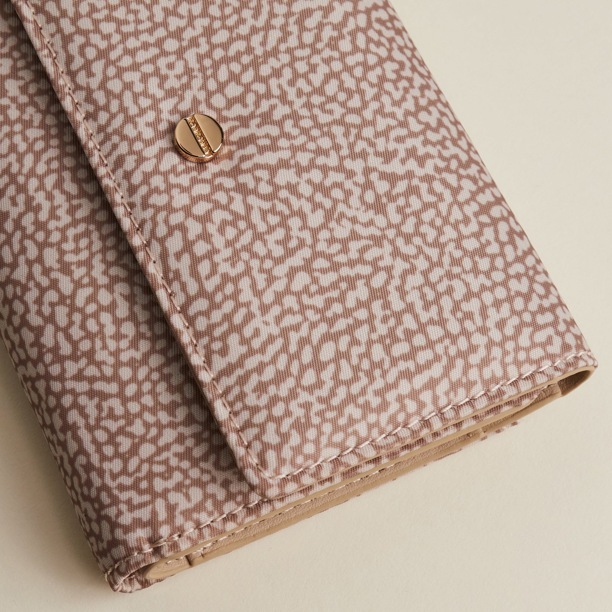 Questo portafoglio rappresenta l'equilibrio ideale tra compattezza e organizzazione. La tonalità Sabbia esalta la delicatezza del pattern Occhio di Pernice, rendendo l'accessorio un pezzo di classe quotidiana, perfetto per chi desidera avere tutto l'essenziale a portata di mano con un design elegante e ordinato.