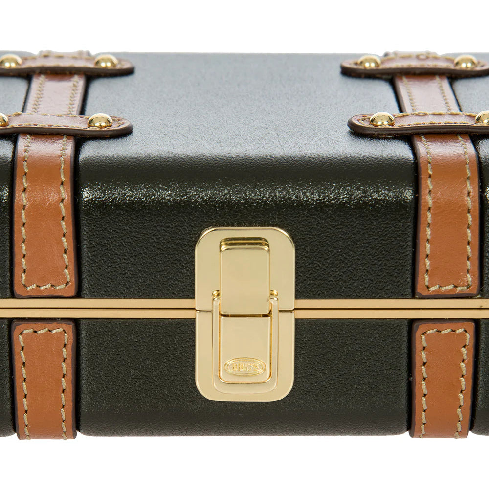Estetica Iconica: Il guscio rigido richiama il design distintivo della collezione Bellagio, impreziosito da inserti in vera pelle di mucca e raffinati rivetti dorati.