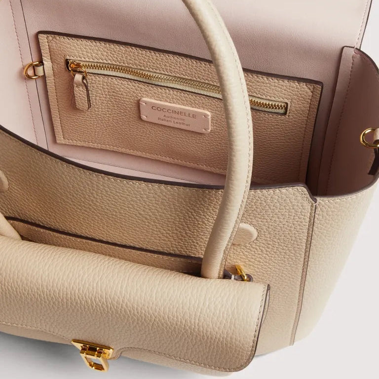 - Dettaglio Iconico: La tasca frontale presenta l'iconico dettaglio plettro Coccinelle, simbolo di identità del brand.
