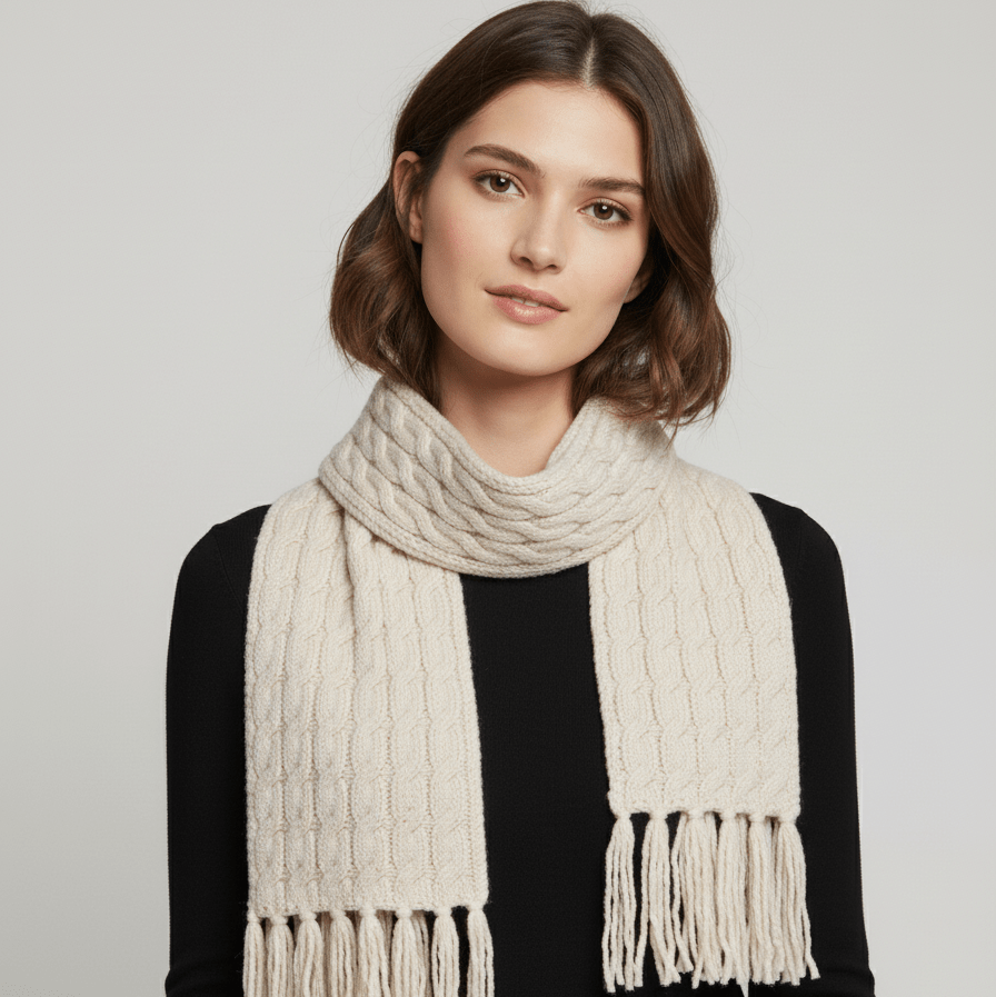 Sciarpa con frange caratterizzata da un effetto maxi tricot all over, perfetto per affrontare ogni giorno con un accessorio unico e indispensabile. Completa il tuo look con la cuffia in coordinato.