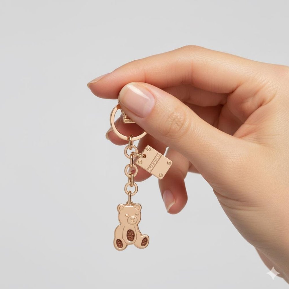 Portachiavi di metallo con charms che riproducono la targhetta "Borbonese" accompagnata da un orsetto color Oro. Può essere utilizzato come decorazione per impreziosire la tua borsa preferita. Galvanica in oro chiaro.