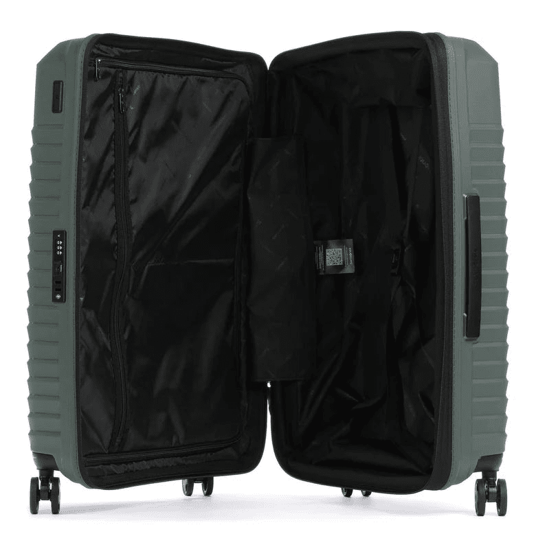 - Esterni Aggiuntivi: Piedini protettivi in plastica, funzione espandibile per maggiore capacità, etichetta per valigia estraibile.