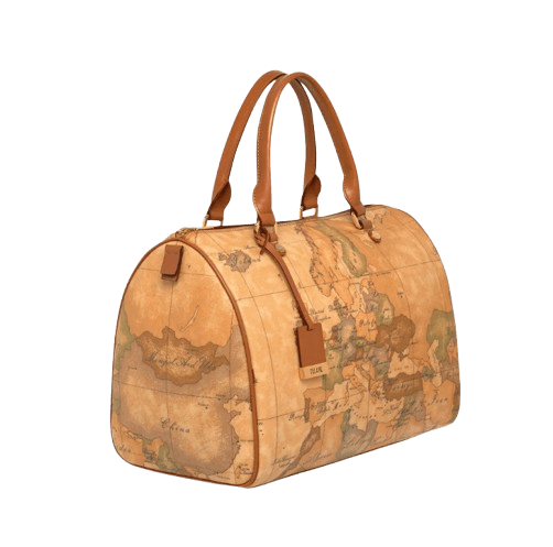 Borsa a bauletto in tessuto stampato con cartina geografica Geo Classic con manici tubolari in pelle color cuoio, metalleria con logo 1ᴬ Classe e finiture in oro, chiusura con zip. Disponibile in due misure, capiente e versatile, saprà adattarsi con stile a tutti i tuoi look.
