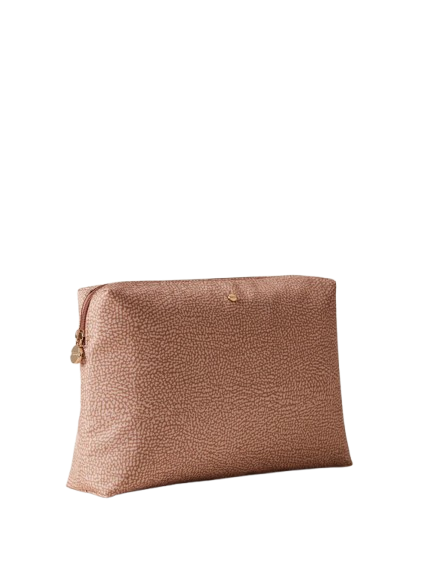 La busta Medium di nylon riciclato stampato OP con dettagli di pelle, diventa un beauty case indispensabile soprattutto nei viaggi. La chiusura dell'articolo è regolata da una zip con tiralampo a forma di vite, simbolo iconico del brand. L'interno è foderato con tasca porta telefono, e tasta dotata di zip. Tutte le metallerie sono in galvanica oro chiaro.